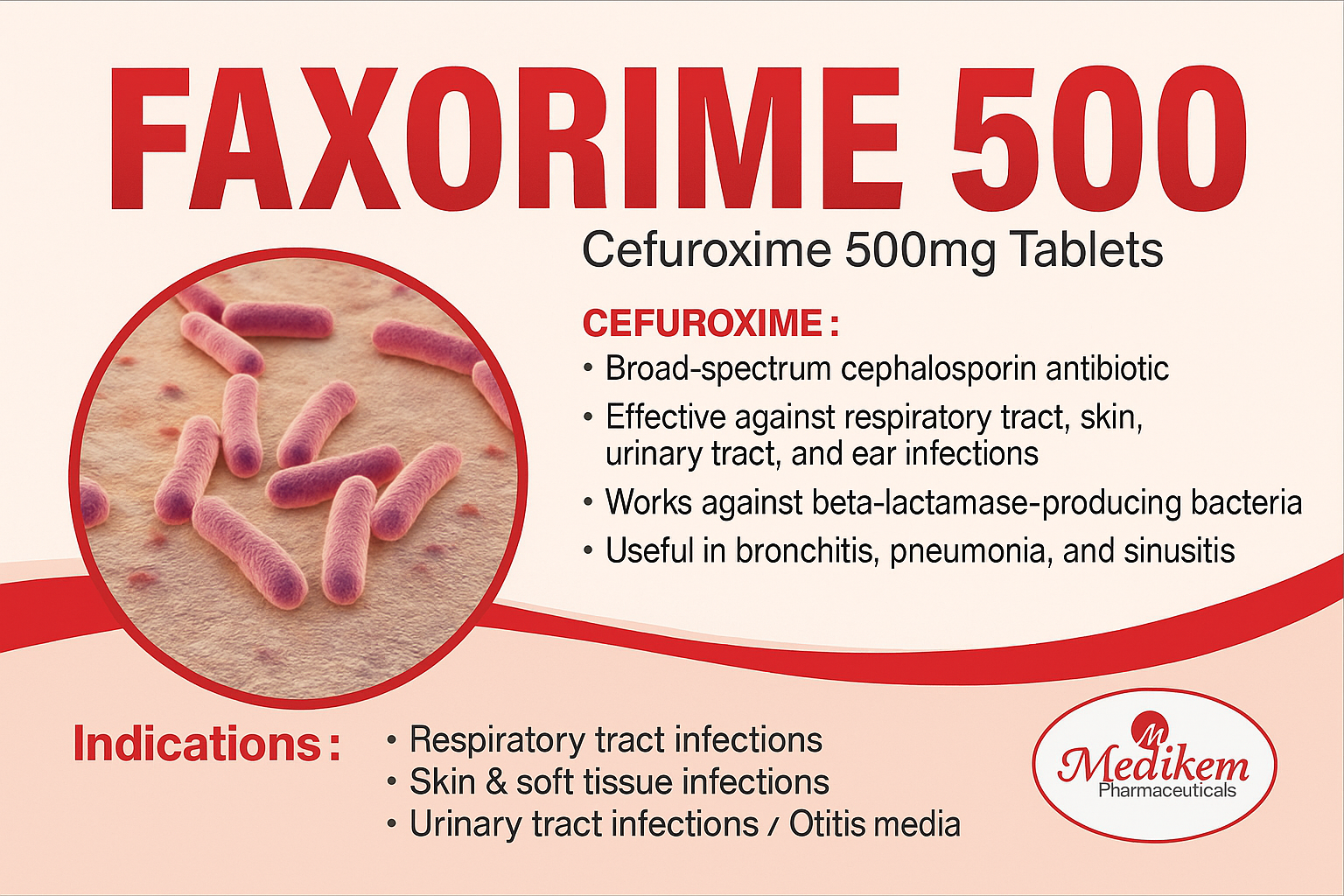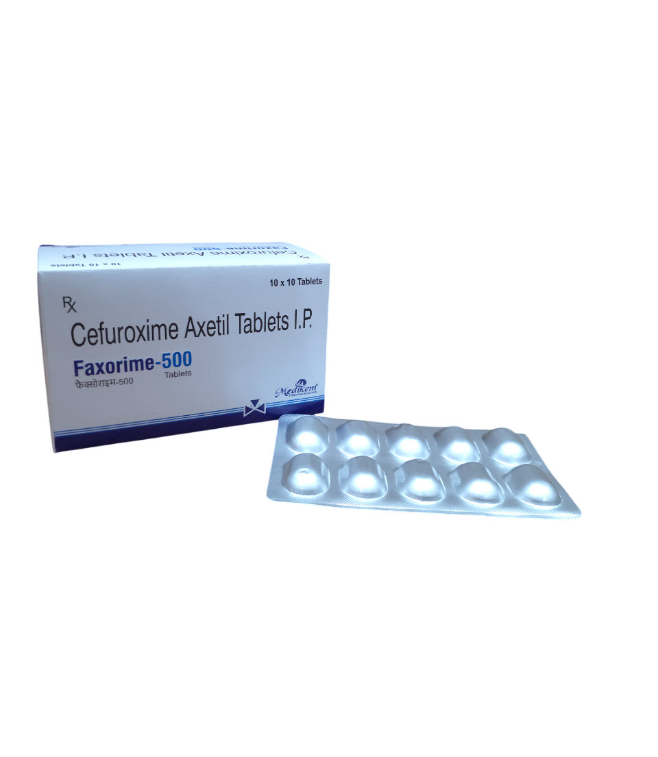 Faxorime 500mg Tablet should be taken with food to avoid an upset stomach. Take it regularly at evenly spaced intervals as per the schedule prescribed by your doctor. Taking it at the same time every day will help you remember to take it. The dose will depend on what you are being treated for and the severity of your condition. Make sure to complete the full course. It will not work for viral infections such as the flu or the common cold. Using any antibiotic when you do not need it can make it less effective for future infections.